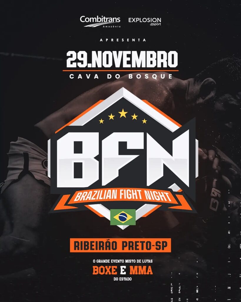 O Brazilian Fight Night, que acontece neste sábado, 29 de novembro, na Cava do Bosque, em Ribeirão Preto, reunirá 15 lutas em uma única noite, incluindo dez disputas de cinturão. O evento, organizado pela Explosion Sport, promete movimentar o cenário nacional do MMA (Artes Marciais Mistas) e reunir atletas brasileiros de destaque, incluindo nomes do Ultimate Fighting Championship (UFC), como Márcio Pedra, Wendel Negão e Fernando Santo Forte.